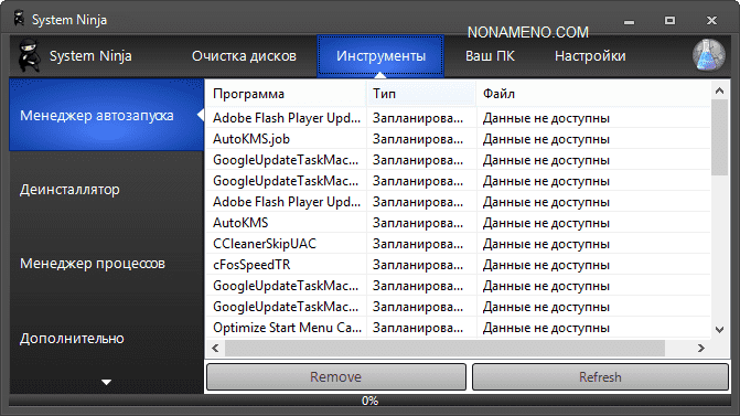 Программа System Ninja делает хороший тест файловой системы, очищает историю системного реестра, выполняет регулирование программами в авто запуске, может выполнять розыск вредных приложений в процессе анализа файлов, имеется функция целиком и полностью удалять компьютерные программы из операционной системы.