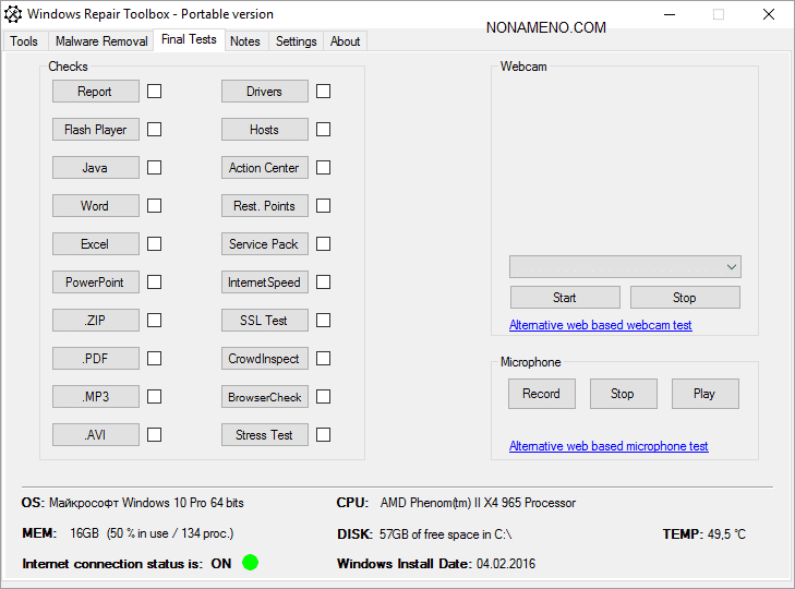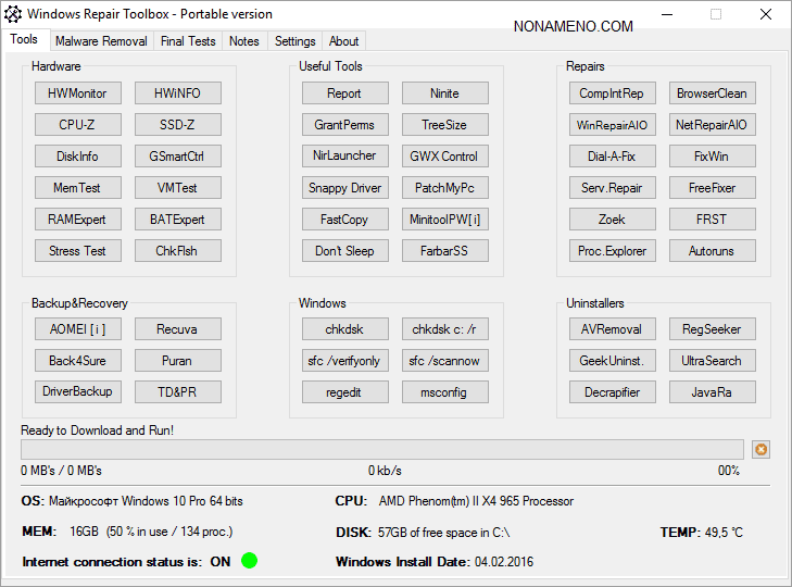 Программа Windows Repair Toolbox покажет необходимые сведения о персональном компьютере, как например температуру цп, размер оперативной памяти, величину доступного места на носителе С и так далее. Вы имеете возможность использовать тексты, после завершения обслуживания вашего персонального компьютера. Вы можете хранить заметки которые связаны с починкой, для того чтобы видеть в какое время и что вы производили крайний раз.