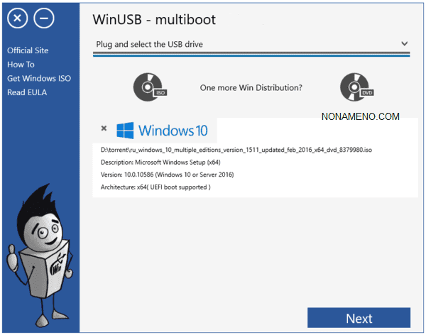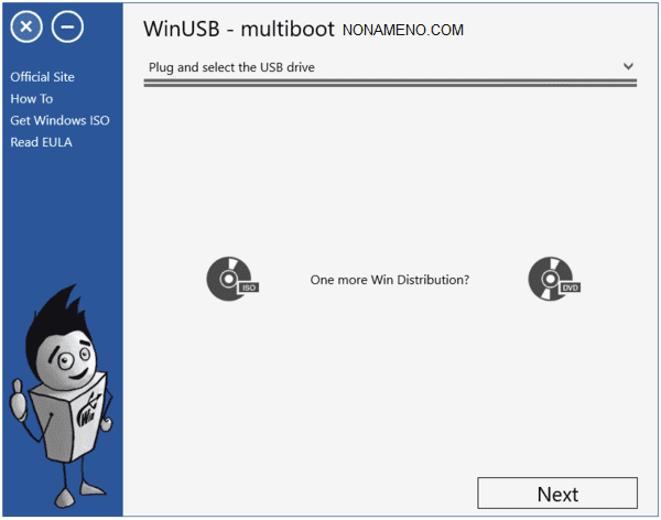 После запуска надо выбрать какое съемное устройство вы хотите использовать, далее надо выбрать установочный DVD диск с Windows 7 и выше или же указать ISO образ на HDD если таковой есть.