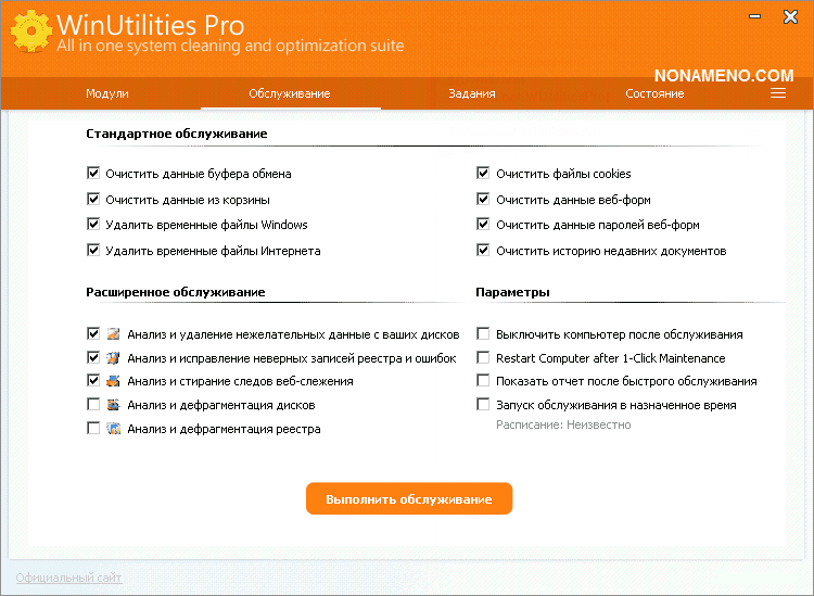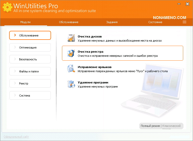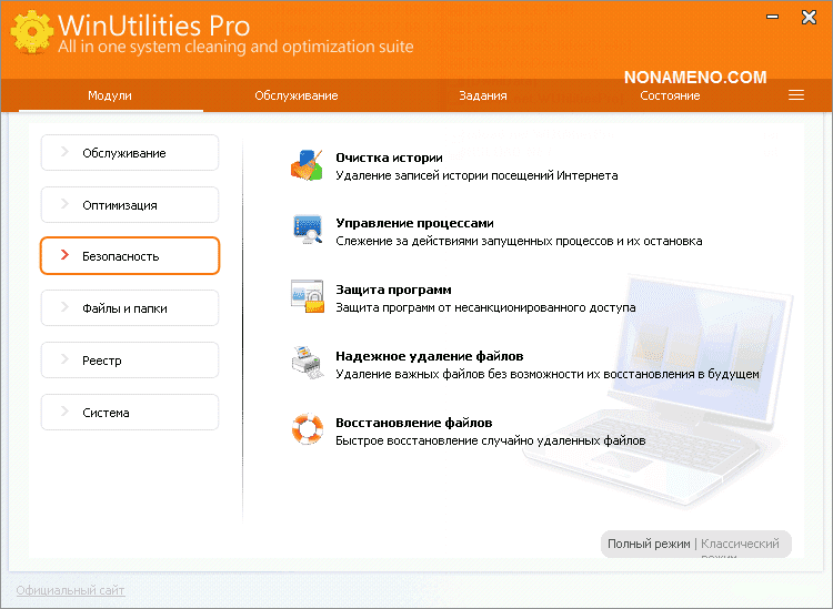 Перечень программ: разумеется вы можете подчищать жесткие диски от различного вида мусора; кроме того вы можете вычищать системный реестр, где со временем собирается масса мусора; имеется инструментарий для правки ярлычков; возможно целиком и полностью стирать приложения поставленные в текущей ОС; WinUtilities дополнительно может дефрагментировать hdd; оптимизировать оперативную память, освобождая намного больше места для ресурсоемких программ; возможно корректировать перечень загружаемых приложений в процессе загрузки ОС; имеется функция подчищать все остатки активности собственного присутствия в интернет-сети; можно конечно восстанавливать удаленные компьютерные данные; отыскивать дубликаты; WinUtilities может делать запасную качественную копию системного реестра; если есть желание вы можете регулировать надстройки ОС Windows.