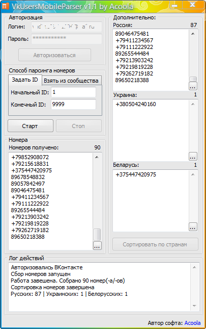 Сбор номеров осуществляется либо со страниц пользователей по указанному диапазону их идентификаторов, либо со страниц пользователей, состоящих в указанной группе ВКонтакте.