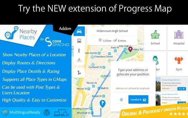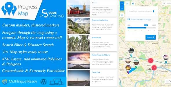 Progress Map плагин карты wordpress - для записей, основанных на местоположении. Цель состоит в том, чтобы помочь пользователям, имеющим веб-сайты, такие как отели, недвижимость, рестораны, вакансии, магазины и многое другое ..., чтобы показать их местоположение на карте Google и легко перемещаться по карте с помощью карусели.