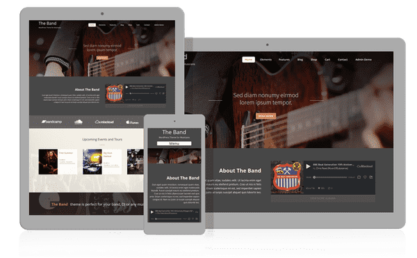 Band отзывчивый шаблон тема для групп и музыкантов - специально разработанная для групп, ди-джеев, концертов и музыкантов. Дизайн представляет собой сочетание более темных и более легких элементов, с акцентом на большие изображения или видео.
