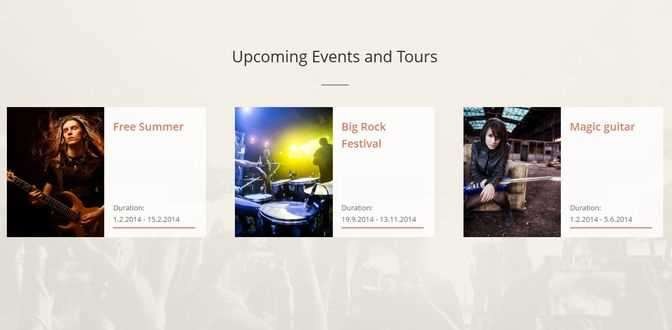 Тема включает в себя такие музыкальные элементы, как Mixcloud и SoundCloud, а также встроенные функции встраивания видео Youtube и Vimeo. Вы также можете добавить большое видео с автозапуском на свою домашнюю страницу. Менеджер событий позволяет вам добавлять информацию о концертах и групповых турах в любом месте вашего сайта.