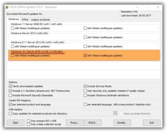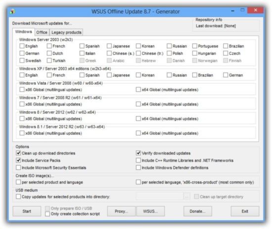 В список загружаемых компонентов, можно как включать так и исключать сервис-паки, разные библиотеки и прочие мелочи. WSUS Offline Update позволяет по окончании загрузки провести верификацию загруженных вами обновлений, можно все данные сохранить в образе ISO, что очень удобно.